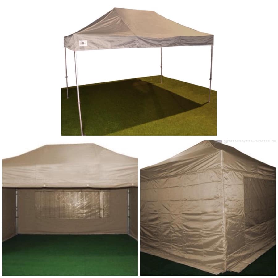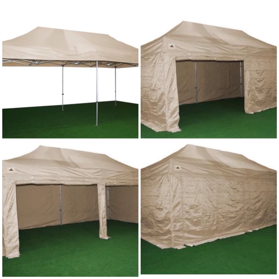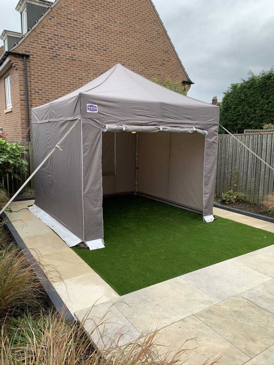 The price includes your choice of Marquee, canopy, 1 side wall with zipped doorway, 1 sidewall with window including blind and 2 blank side walls. Standard installation on a grass surface is included along with local delivery.