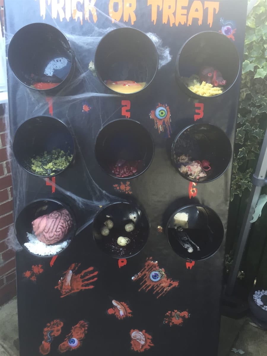 The game has 9 buckets which you can put gouhlish lotions and pitons in for your guests to touch and guess the contents, we can supply some ideas and small props or you can make your own up.