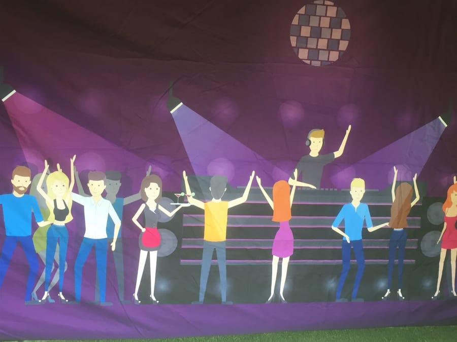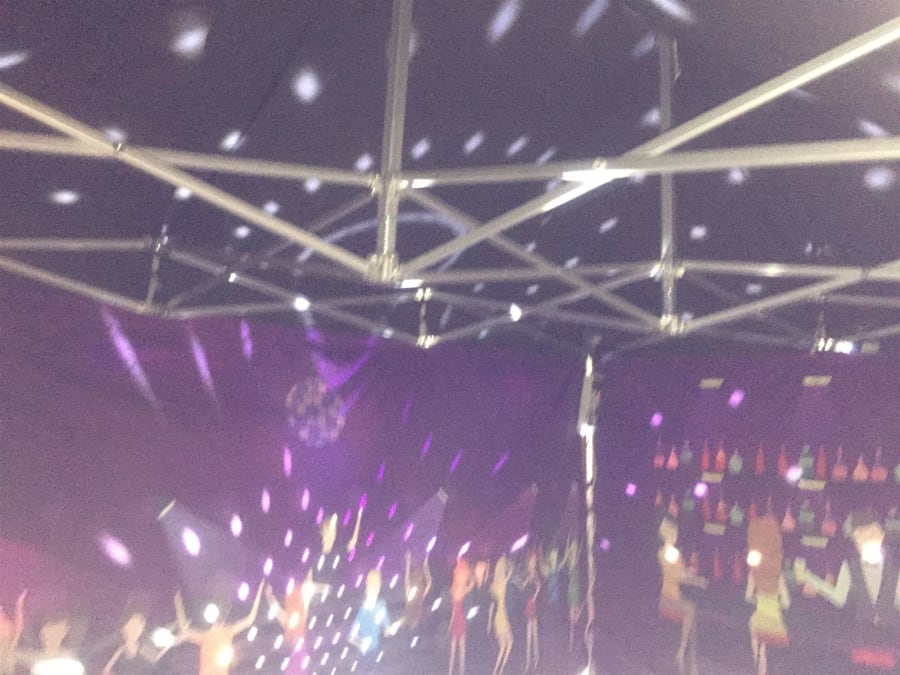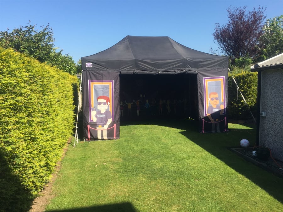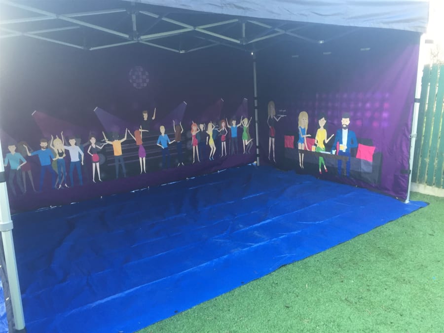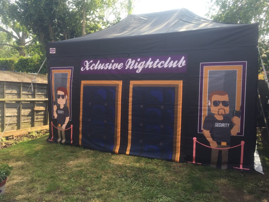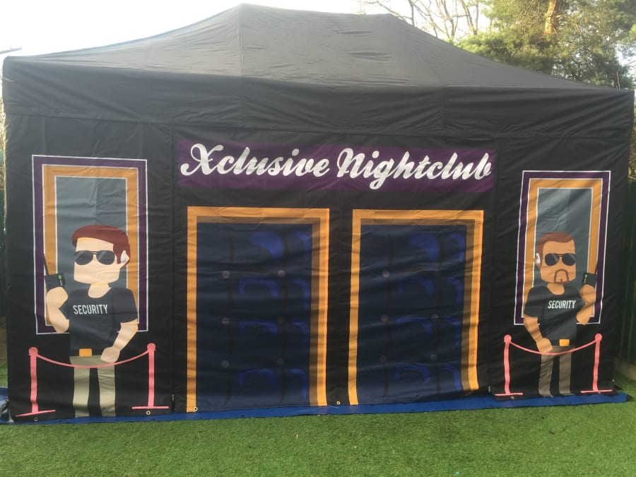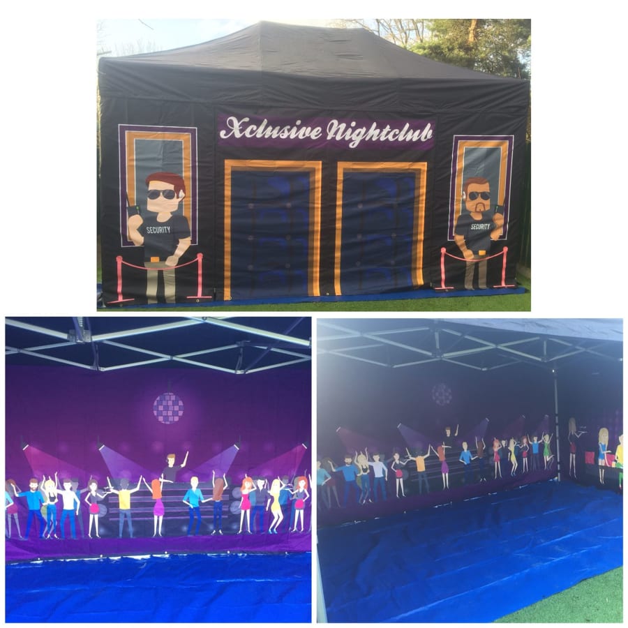We believe we have the answer here, our brand new popup nightclub, based on our 3m X 4.5m mini marquee the whole marquee is constructed of black fabric with night club graphics to the front and inside walls.