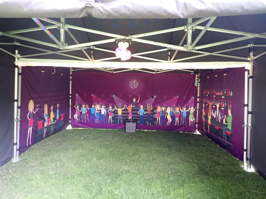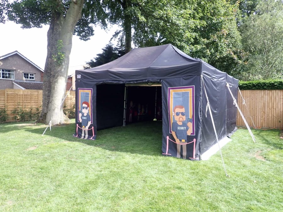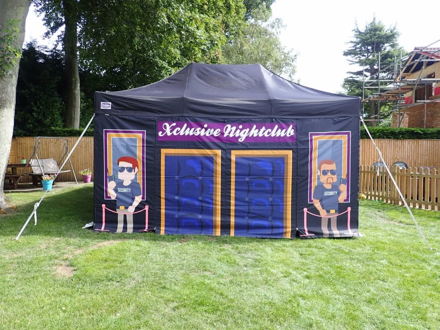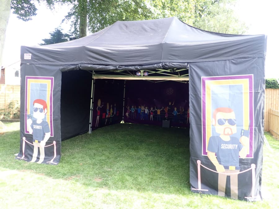 Double popup nightclub, based on our standard popup nightclub but twice the size measuiring 6m X 4.5m, the whole marquee is constructed of black fabric with night club graphics to the front and inside walls.